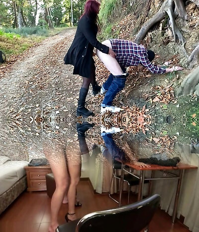 Mistress Nika fucked her slave in the ass in the park without lube. Pegging in public doggy style with ass spanking