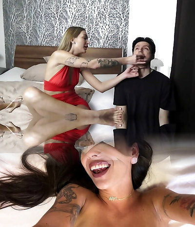 Glamour hotties fuck slave's face crevasse with feet and toys