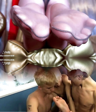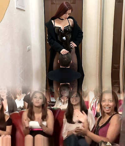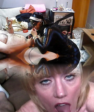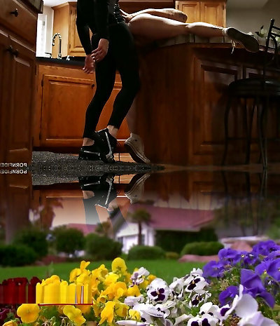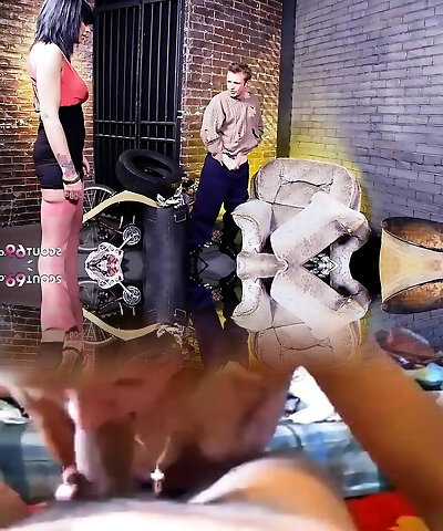 Mistress in overknee ballet heels undergarments and latex gloves fucks let slave guzzle his cum!