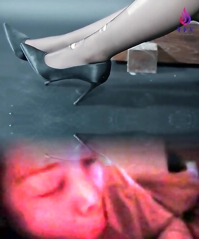 Ash-blonde teen in tight blue dress and shiny glossy tights spanked rock hard on her brilliant ass plus slow motion